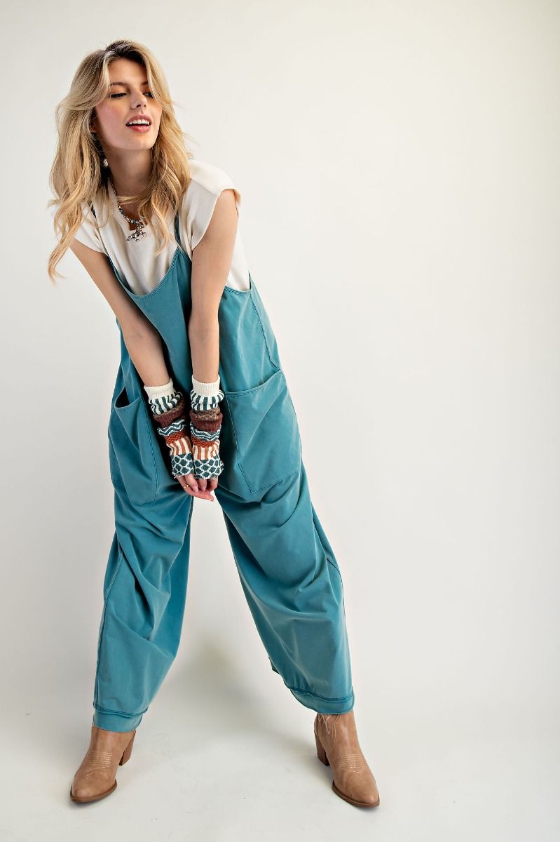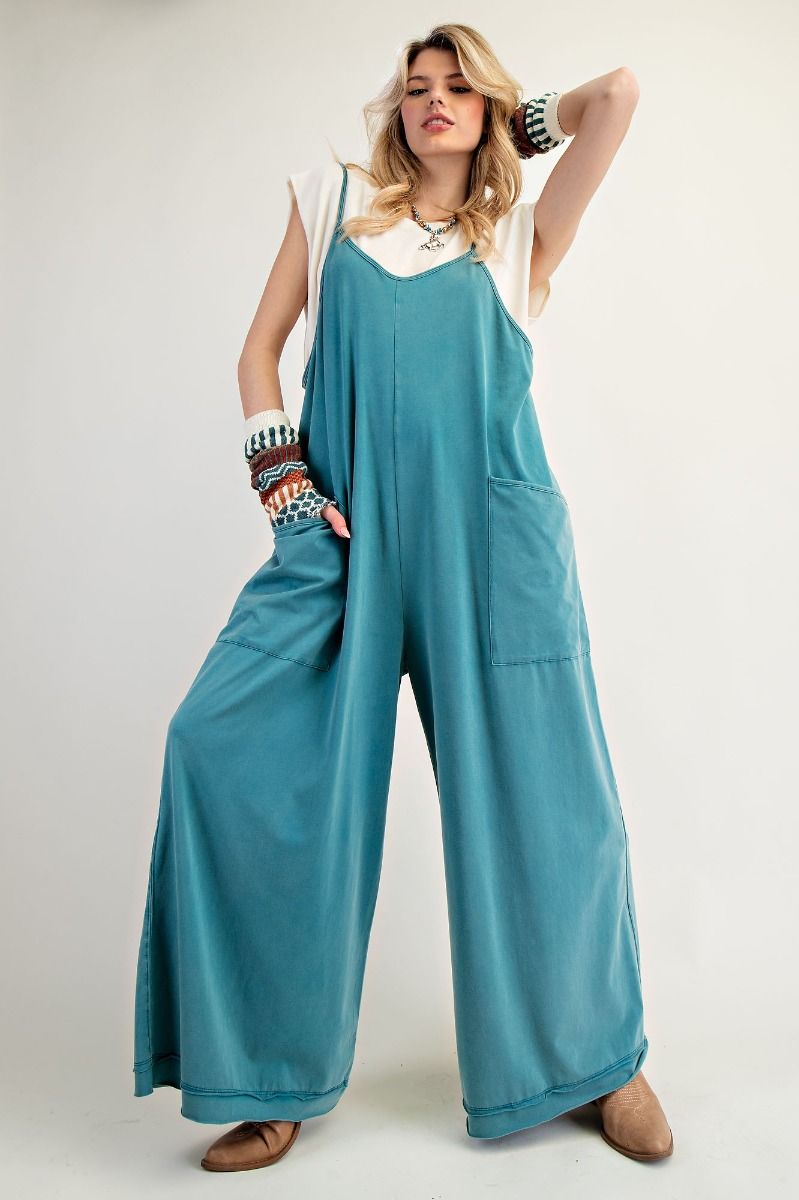 This relaxed-fit jumpsuit blends comfort with easy style. Featuring wide-leg pants, oversized patch pockets, and a flattering V-neckline, it brings a laid-back, utilitarian edge with a touch of vintage cool. The sleeveless cut and soft, washed slate blue tone make it a versatile, throw-on-and-go favorite for year-round wear. Whether you're dressing it up or keeping it casual, this piece lets your personal style shine.”